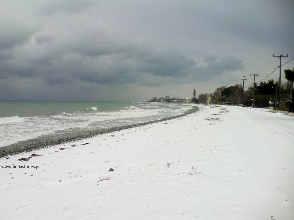 Το χιόνι έφτασε μέχρι και την παραλία της Λεπτοκαρυάς Πιερίας όπου έγινε ένα με τη θάλασσα.
