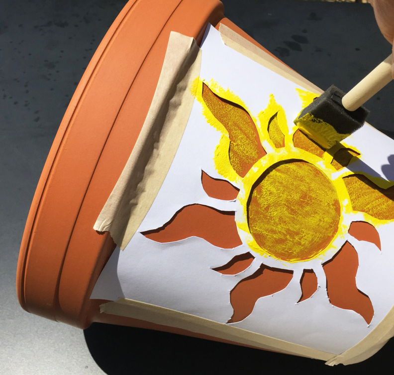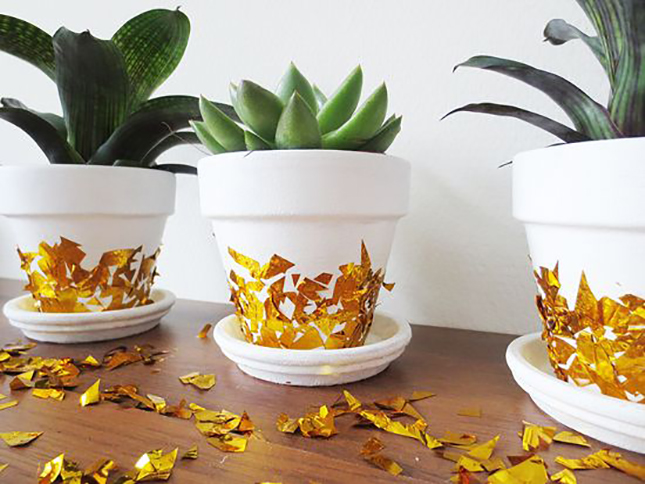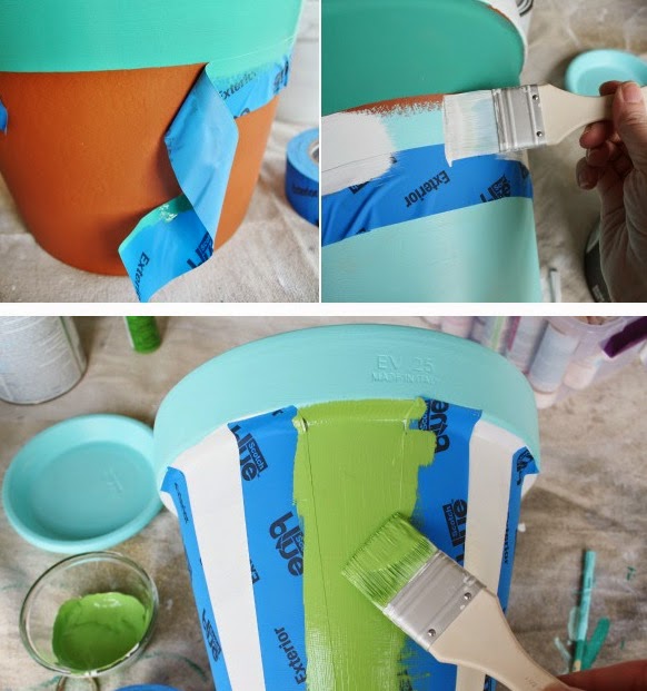 Τα stencils από τις πιο πρακτικές και με εξαιρετικό αποτέλεσμα επιλογές, όπως και οι ρίγες που εύκολα θα ζωγραφίσετε με την βοήθεια κολλητικής ταινίας, ενώ και η παλαιωμένη όψη χρησιμοποιώντας μπογιά σε άσπρη, καφέ και μπλε-πράσινη απόχρωση εναλλάξ και “σβήνοντας” με ένα σφουγγάρι το κάθε χρώμα πριν περάσετε κατά τόπους το επόμενο είναι μια πολύ ιδιαίτερη και όμορφη επιλογή που ταυτόχρονα σας δίνει την ευκαιρία να ομορφύνετε παλιές γλάστρες μετατρέποντας τα φθαρμένα σημεία τους σε …μέρος του σχεδίου δείτε εδώ αναλυτικά την διαδικασία και εξίσου εντυπωσιακά και τα γλαστράκια που θα βάψετε με πολύχρωμα βερνίκια νυχιών.