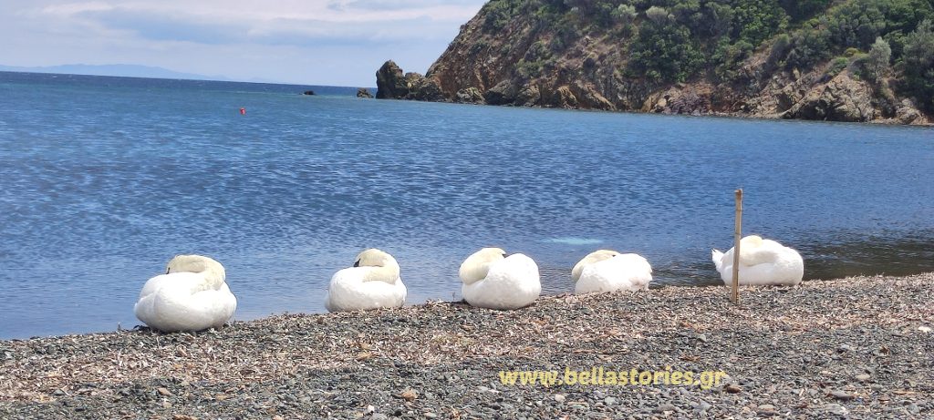 Μια μοναδική επίσκεψη επεφύλασσε η χθεσινή μέτρα για όσους βρέθηκαν στην παραλία της Χαραμίδας για το μεσημεριανό τους μπάνιο. Πέντε πανέμορφοι κύκνοι πέταξαν στην ακτή και επέλεξαν να ξεκουραστούν και να κοιμηθούν σε μια από τις ήσυχες γωνιές της ακτής του κόλπου. Αφού πήραν έναν μεσημεριανό υπνάκο ξύπνησαν και ξεκινήσαν τις βόλτες τους κατά μήκος της ακτής.