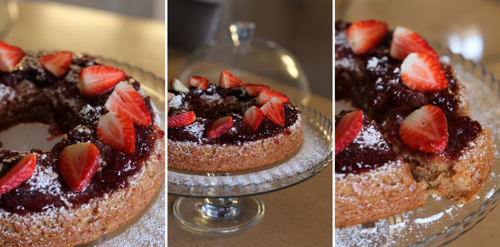 Όταν το κέικ μας είναι έτοιμο το αφήνουμε να κρυώσει καλά κι βάζουμε από πάνω τη μαρμελάδα και τις φράουλες!