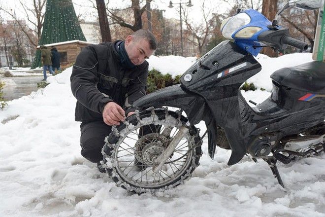 Με γνώσεις σιδερά κατάφερε να φτιάξει μέσα σε μια ημέρα αντιολισθητικές αλυσίδες για το μηχανάκι του και βγήκε στους δρόμους. Και όχι μόνο βγήκε αλλά δούλεψε κιόλας χωρίς να σταματήσει ούτε μια ημέρα. Άλλωστε γι’ αυτό τις έφτιαξε.
