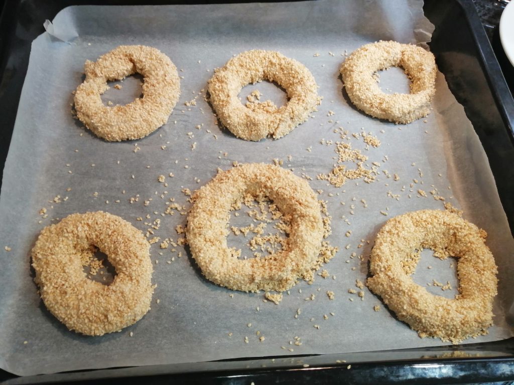 • Βουτάμε το κάθε κουλούρι μέσα στο νερό και αμέσως μετά στο μπολ με το σουσάμι.