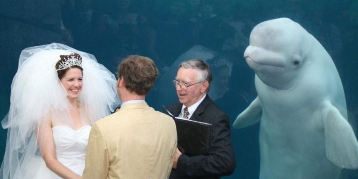 Το πώς μια στιγμή μπορεί να έχει χιλιάδες νοήματα και μια εικόνα να ξεπερνά τις 1000 λέξεις αποδεικνύεται μέσα από την μοναδική αυτή φωτογραφία, μιας νύφης, η οποία αποφάσισε να παντρευτεί μπροστά από ένα ενυδρείο στο Connecticut, αλλά υπολόγιζε χωρίς… τον ξενοδόχο, αφού ένα δελφίνο θέλησε να πάρει μέρος στο μυστήριο με τον δικό του τρόπο.