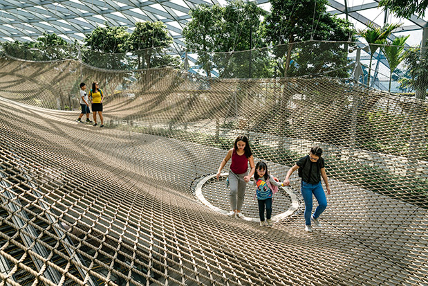 Κάτω από αυτόν τον ουρανό, στον τελευταίο όροφο του Jewel με τις δεντροστοιχίες, βρίσκεται το Canopy Park, το οποίο επισκεφθήκαμε για να ζήσουμε εμπειρίες θεματικού πάρκου (τα εισιτήρια ενηλίκων ξεκινούν από 5 δολάρια Σιγκαπούρης, δηλ. 3,30 ευρώ: λαβύρινθοι, τσουλήθρες και τα εναέρια δίχτυα Manulife Sky Nets – ένα για χοροπήδημα και ένα για περπάτημα, το οποίο και διάλεξα να ακολουθήσω.