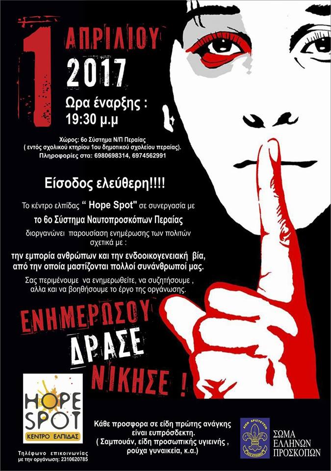Το κέντρο ελπίδας Hope Spot σε συνεργασία με το 6ο Σύστημα Ναυτοπροσκόπων Περαίας διοργανώνει μια πολύ ενδιαφέρουσα παρουσίαση ενημέρωσης των πολιτών σχετικά με την εμπορία των ανθρώπων και την ενδοοικογενειακή βία, από την οποία μαστίζονται πολλοί συνάνθρωποι μας.