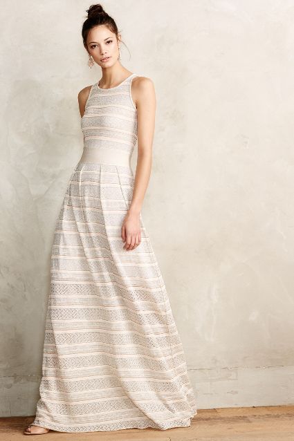 To maxi λευκό φόρεμα σε απόχρωση ιβουάρ και ριγέ print είναι ένα πιο καθημερινό ρούχο που μπορείς να βάλεις με διάφορους τρόπος. Συνδύασε με λευκά sneakers και ένα καπέλο fedora ή βάλε δερμάτινα σανδάλια με μεταλλικές λεπτομέρειες, μία ίδια ζώνη ψηλόμεση και ένα denim καπέλο.