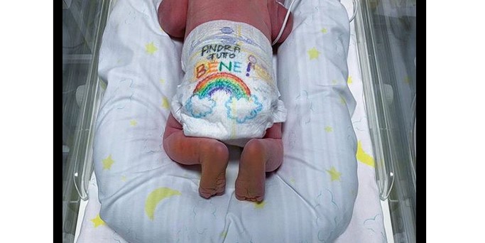Στην φωτογραφία το βλέπουμε ξαπλωμένο μπρούμυτα με το πιο όμορφο μήνυμα γραμμένο στην πάνα του στα πιο ζωηρά χρώματα. «Andrà tutto bene», δηλαδή «Όλα θα πάνε καλά», γράφει. Η viral φωτογραφία έχει γίνει σύμβολο-ζωής, της ζωής η οποία συνεχίζεται,όπως και ο αγώνας κατά του ιού.